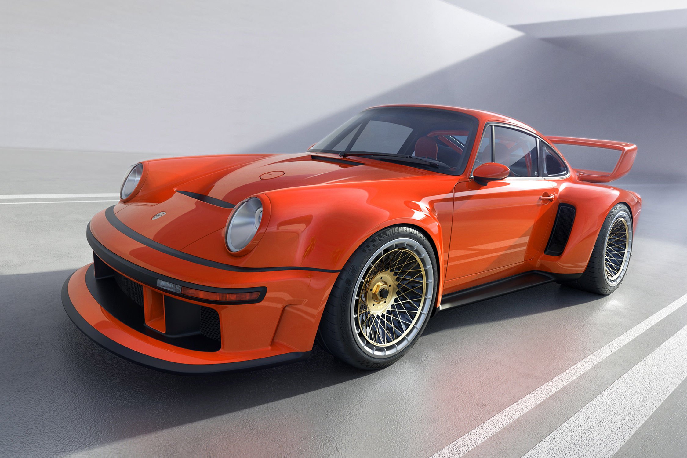 spoiler avant orienté piste. La voiture axée sur la route, reçoit de son côté un aileron arrière ducktail et un