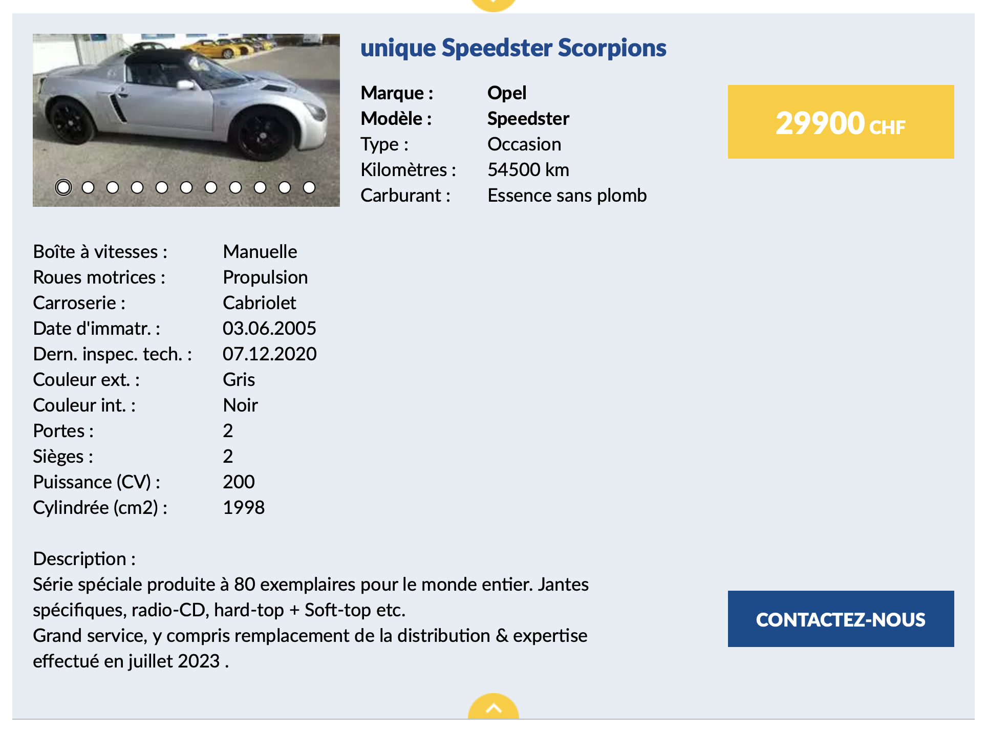 J'avais partagé cette annonce sur la page facebook Opel Speedster en décembre 2020, en 3 ans la voiture n'a pas du tout roulé pas forcément cool, exactement le même nombre de km.. Il a juste baissé la prix, elle était à 36.900 CHF