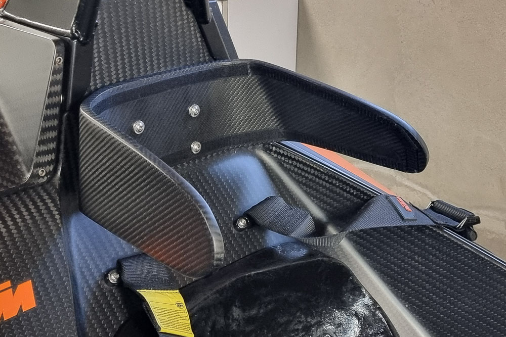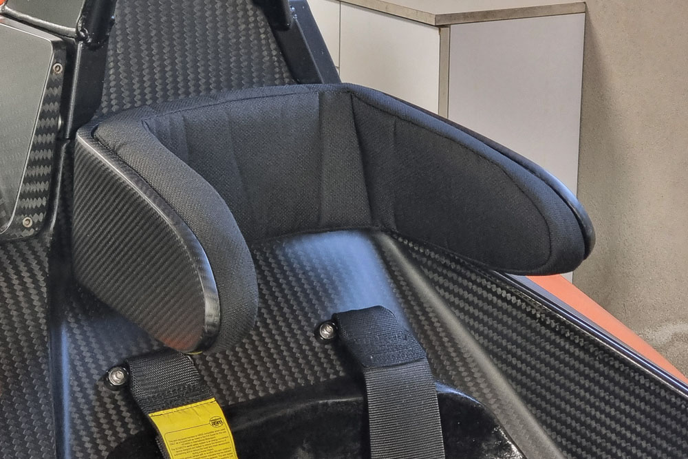 Coussin qui pendouille: c'est l'andouille (ça rime) de vendeur qui ne s'est pas donné la peine de le remettre en place pour les photos. Ni le tissu ni le coussin ne se sont détendus, c'était juste mal positionné. C'est du velcro sur toute la longueur, il peut se déplacer si on l'accroche j'imagine (par exemple en pénétrant (!!) dans l'habitacle), mais il suffit juste de le re scratcher en place ensuite. Je n'ai jamais eu à le replacer ou l'ajuster, sauf quand j'ai dû enlever les headrest pour le Nurburgring (because pas permis, ni le Hans d'ailleurs, en Touristenfahrten). Je te recommande donc la solution très simple d'une bande velcro autocollante (une partie mâle ou femelle sur le carbone, l'autre sur le coussin), ça marche très bien.
