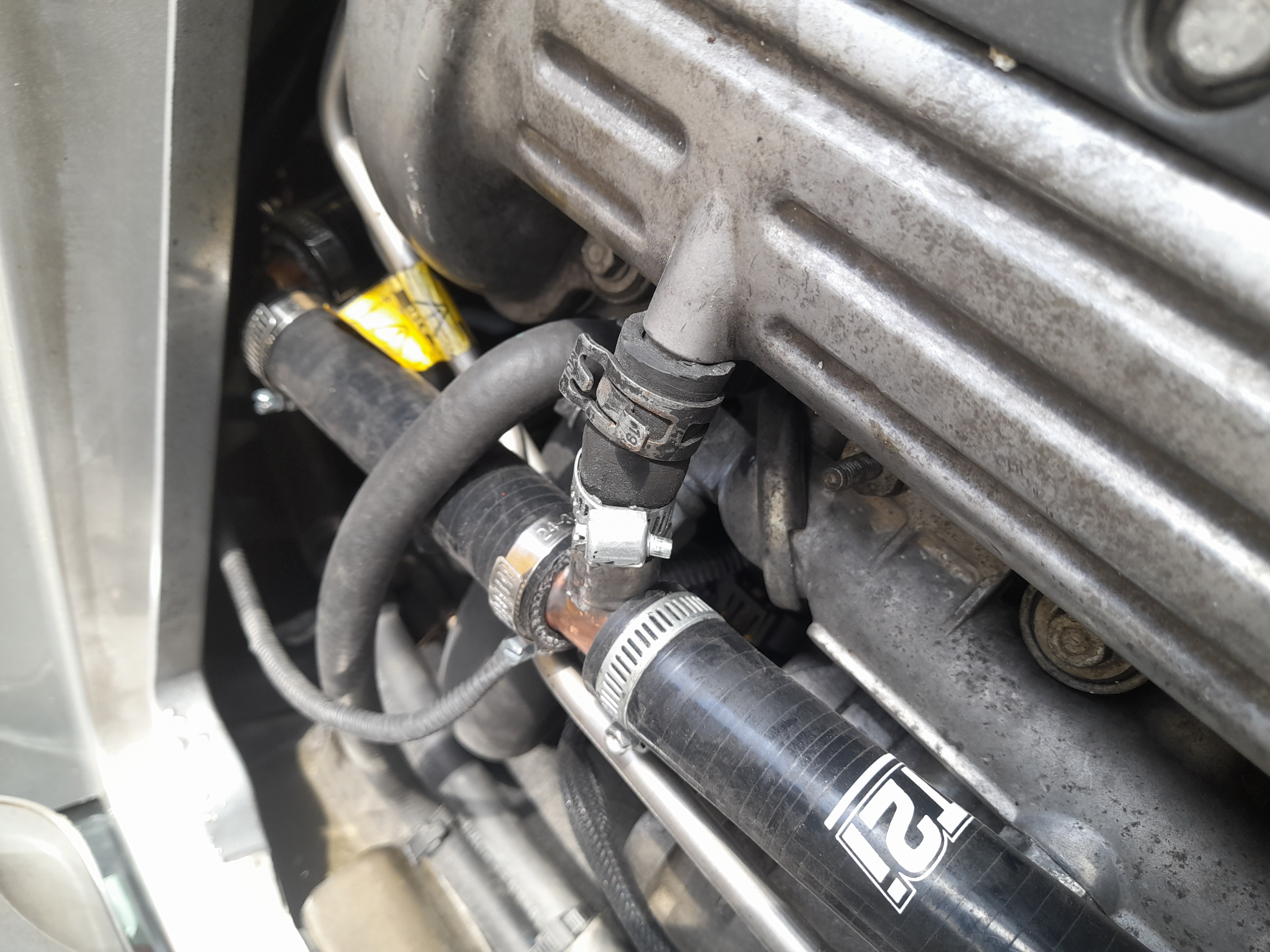 le piquage remonte le long du couvre culasse pour amener récupérer l'évent d'origine ( piquage du té réduit à 10mm).