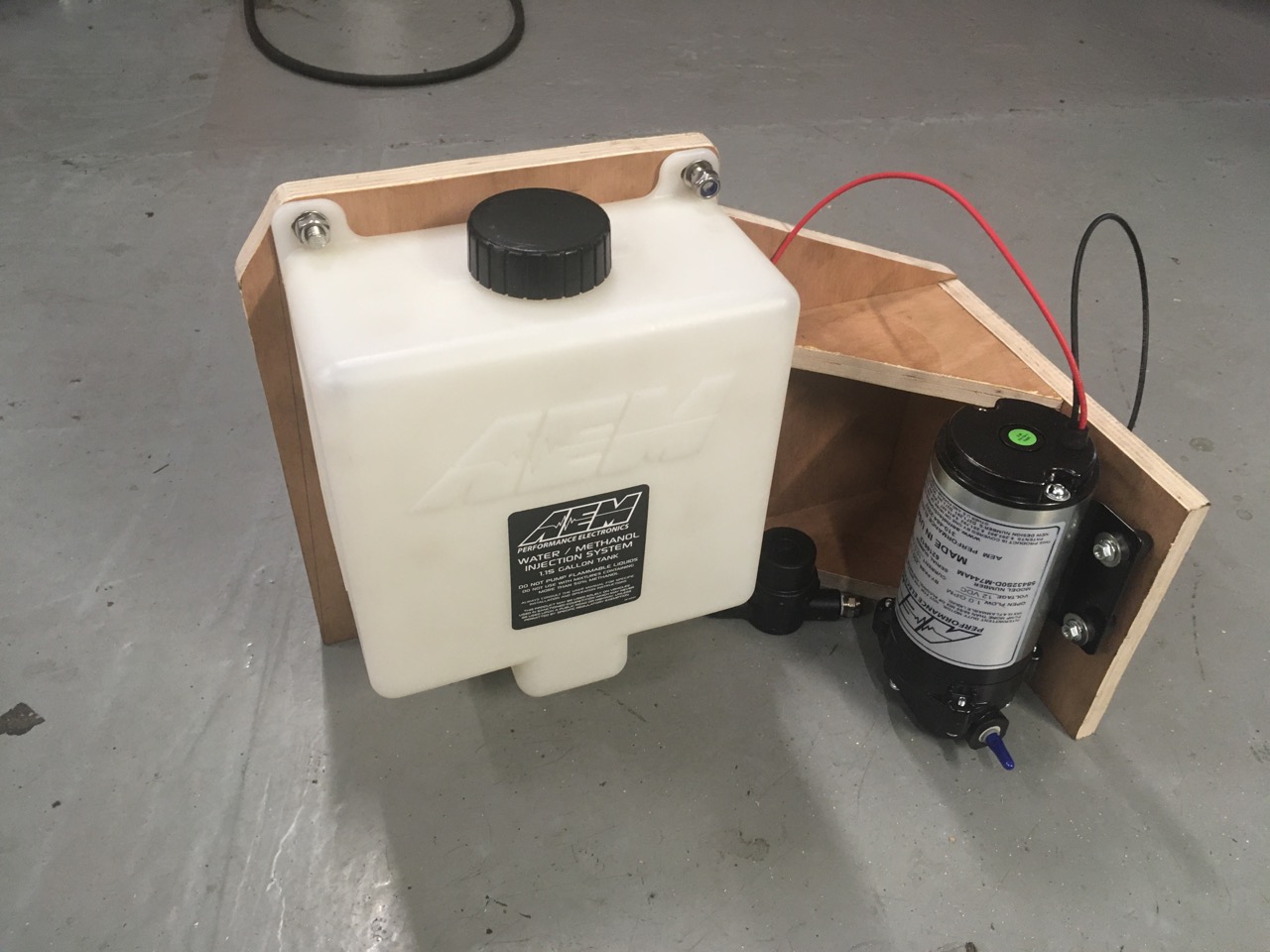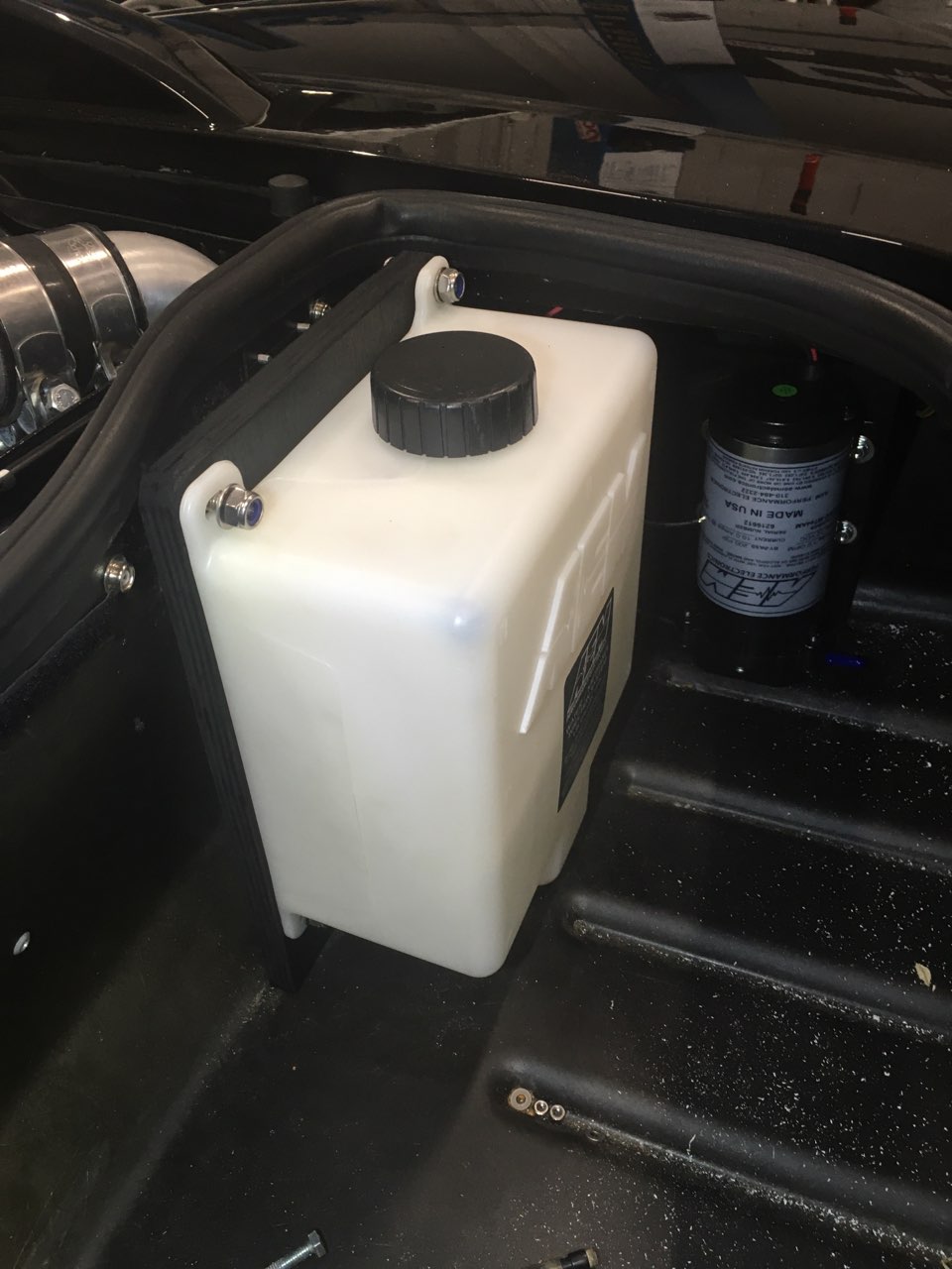 Mais sinon ça consiste surtout à monter un injecteur sur la ligne d'admission quelques centimètres en amont du papillon. Il m'a aussi tirer un fil avec une diode au tdb pour le niveau bas dans le bidon. Pour le montage il trouvait pas ça propre de percer le coffre vu l'épaisseur de celui ci et avec les différentes courbures ça n'allait pas bien. Du coup il a fabriqué ce support pour se reprendre sur des vis d'origine.