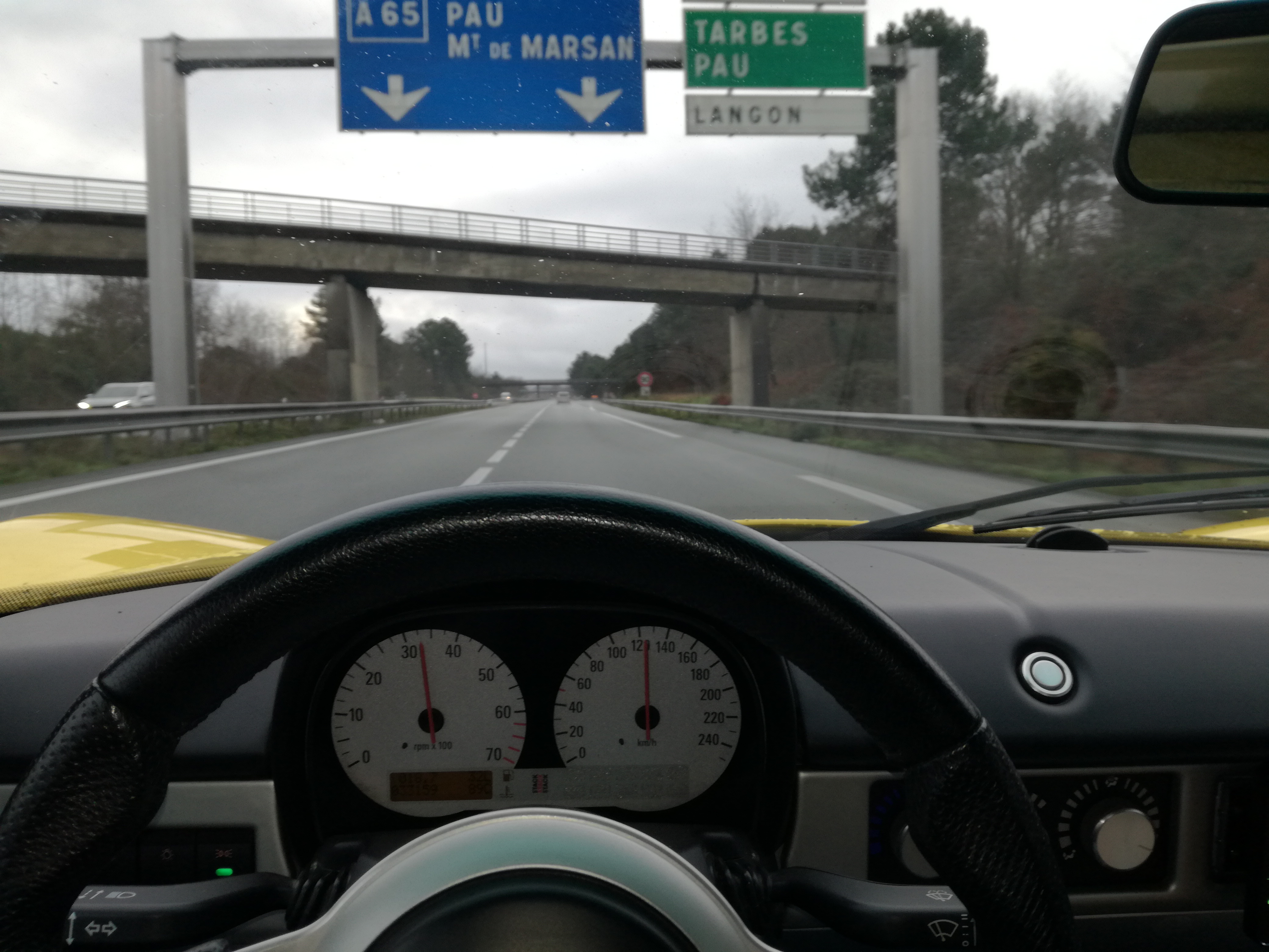 Speedy a dormi dehors entre la Megane de belle maman et le camion de madame... bien serrés pour que personne n'y touche... et ce matin, on refait le plein pour la 12ème fois et on repart direction Toulouse...
