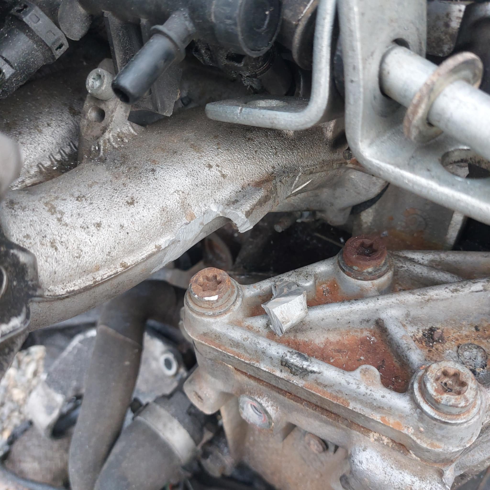Réparation de fortune avec une vis achetée à L'entrepot du bricolage (j'étais en panne à 200m) pour faire un support moteur rigide et rentrer.