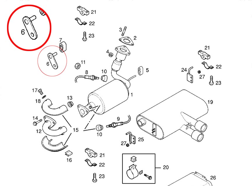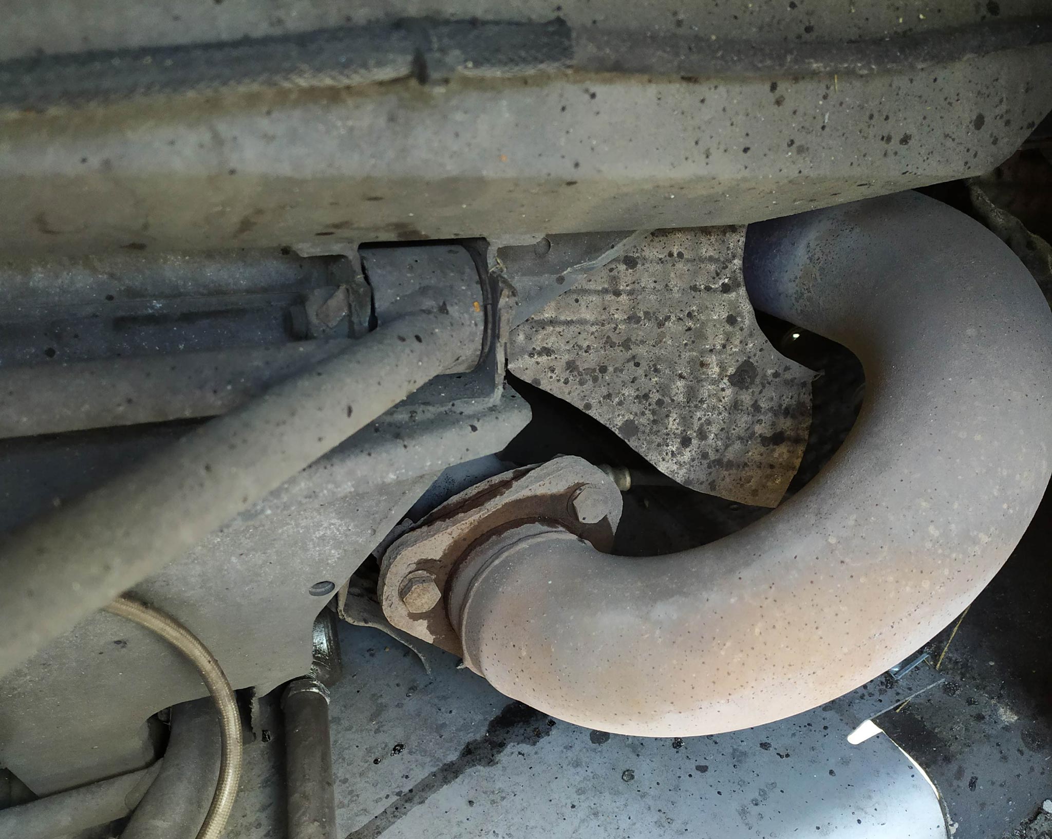 La seule piste est la petite patte en tôle qui tient le coude d'échappement qui est coupée. (patte plate avec un doigt qui rentre dans un silentbloc).