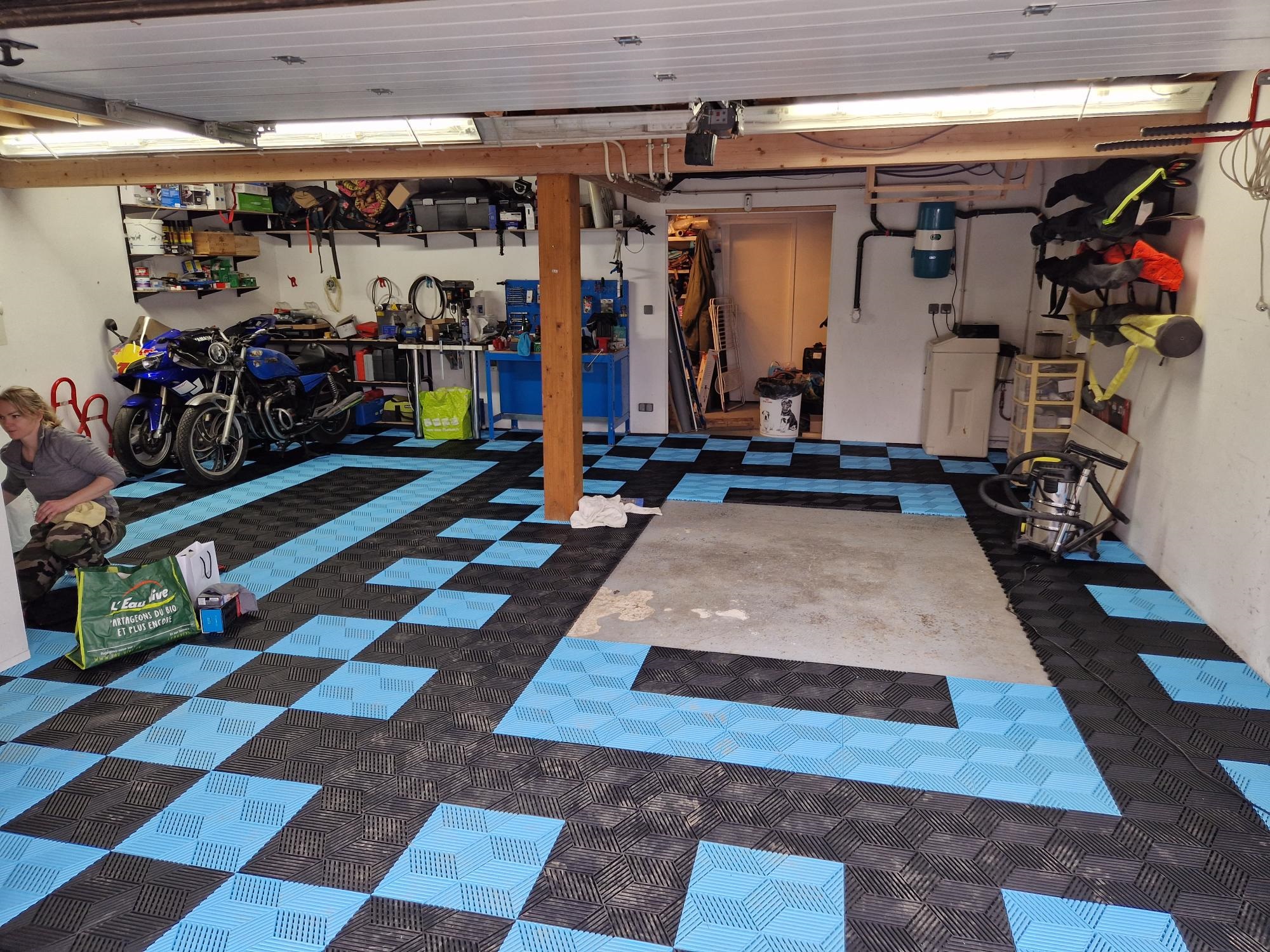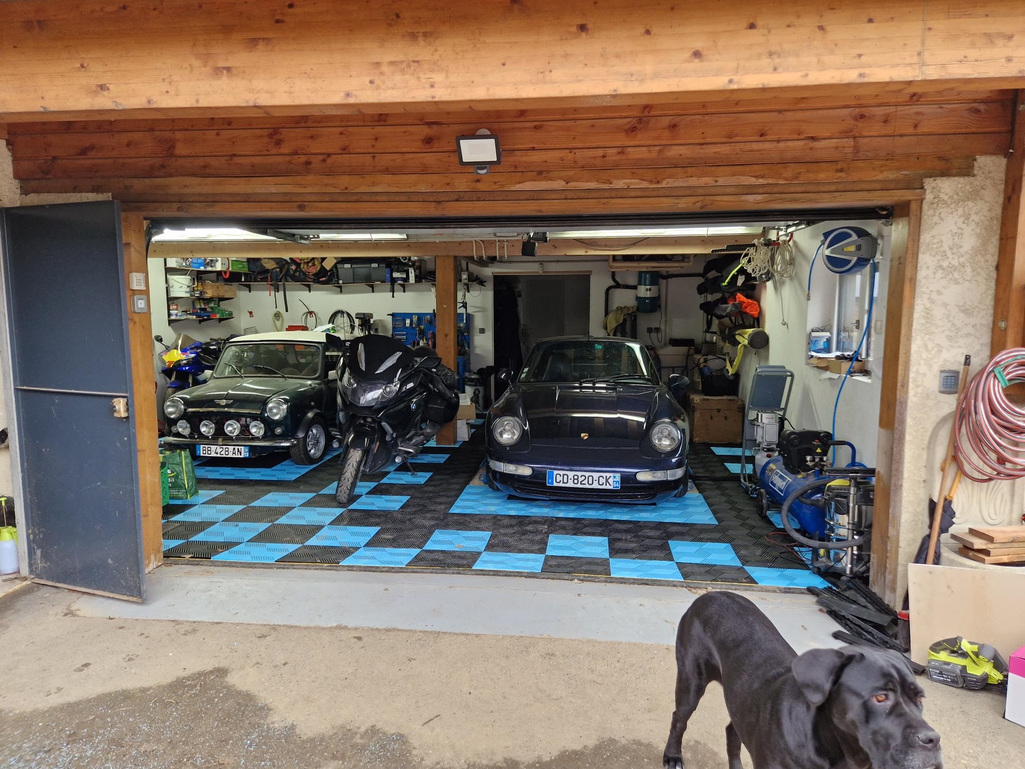 Tout est dehors sauf les établis et meubles que nous déplacerons au moment opportun, on attaque le chantier, très honnêtement, je vous encourage, si vous vous tâtez et avez le budget à poser ce sol. C'est ultra simple, ça se coupe très bien et coup de bol je n'ai eu des découpes qu'au fond. Le simulateur de ANC Dalles vous aide à tout calculer et les commerciaux sont de bons conseils, franchement 0 regret.