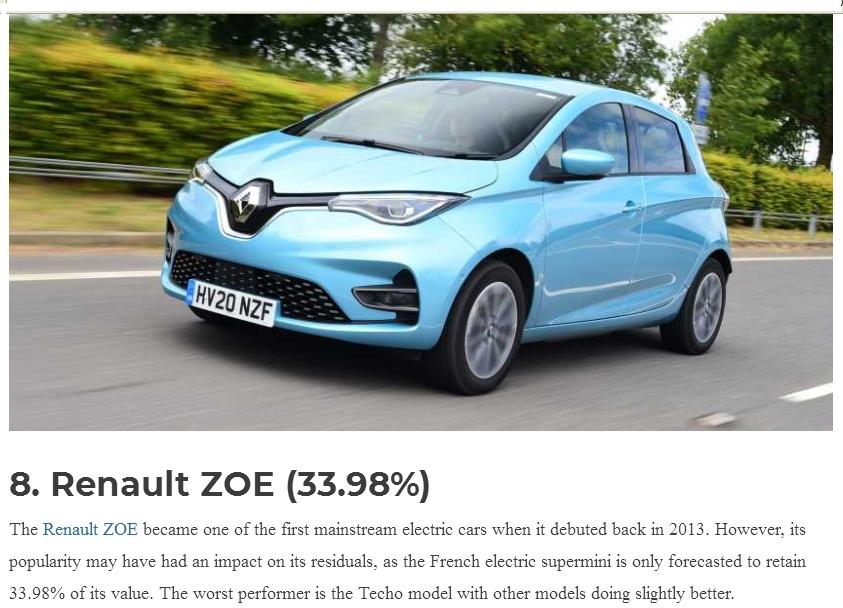 Selon AutoExpress, la Zoé perd 66% de sa valeur dans un comparatif basé sur 3 ans et 36000 miles