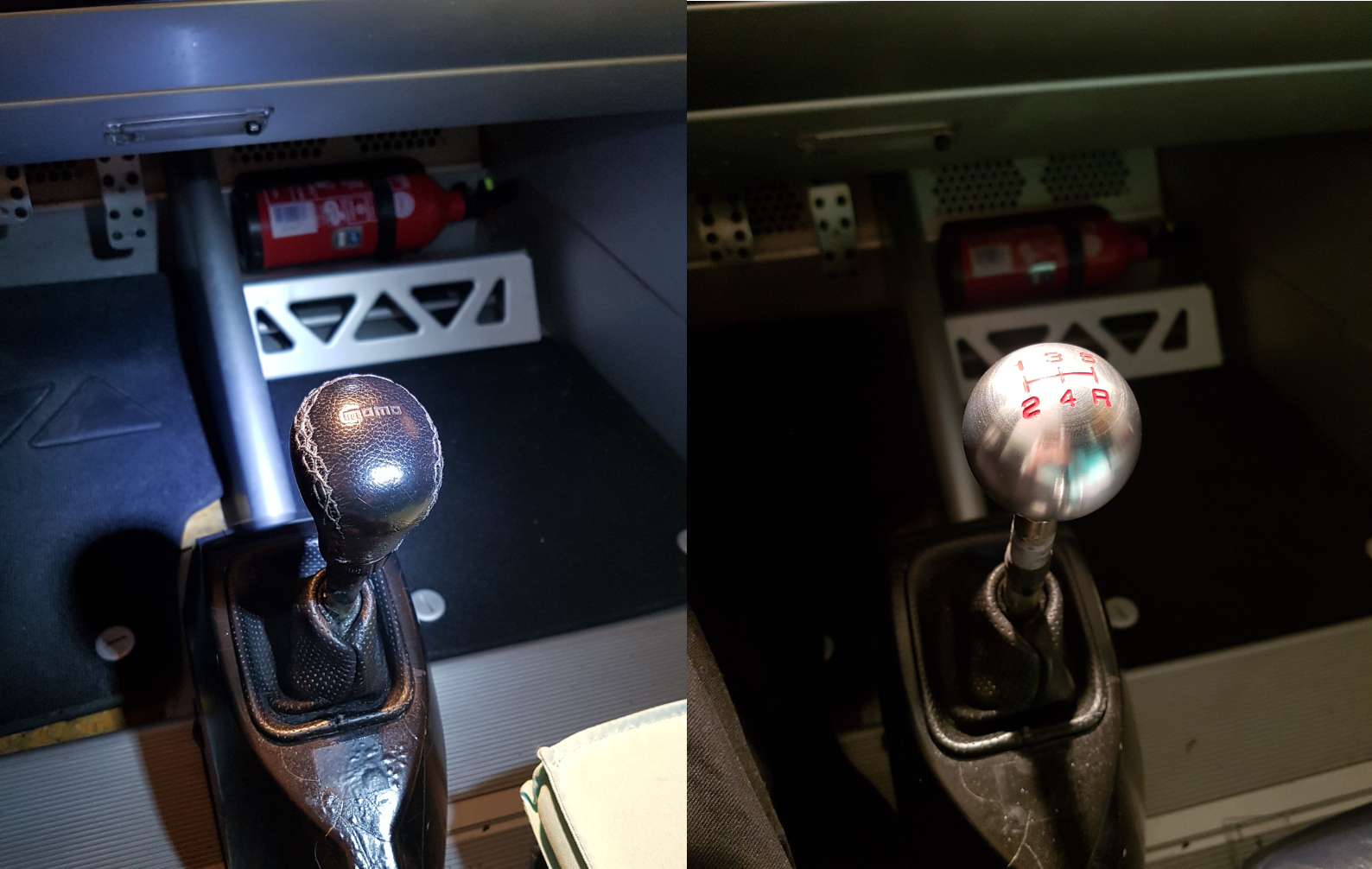 Bon, ok, j'ai du entrer et sortir du Speedster un certain nombre de fois pour essayer de trouver les outils qui allaient bien, j'ai du retirer une épaisseur délirante de chaterton qui avait été mise sous le pommeau, j'ai du tout redémonter parce que j'avais oublié de retirer la bague de l'ancien pommeau (woo !), et j'ai bien perdu 10/15 minutes à essayer de récupérer une des trois mini vis du pommeau Momo qui est tombée et s'est bloquée en équilibre entre le rail du siège passager et le tunnel central. (Je l'ai eue !).