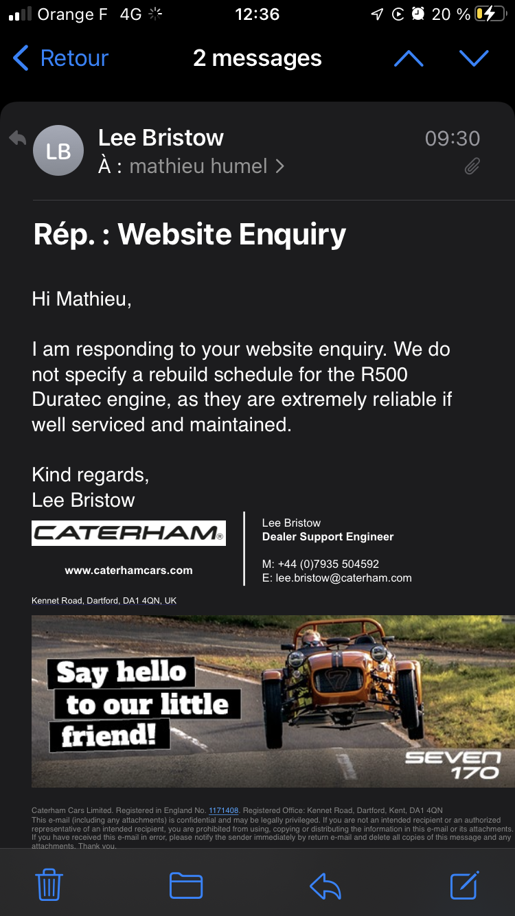 Jpastor a écrit : Bonjour à tous, je vais mettre en vente ma R500 Duratec, enfin je crois. Je pense que je vais le regretter, mais j'ai une très grosse envie de V10 italien...
