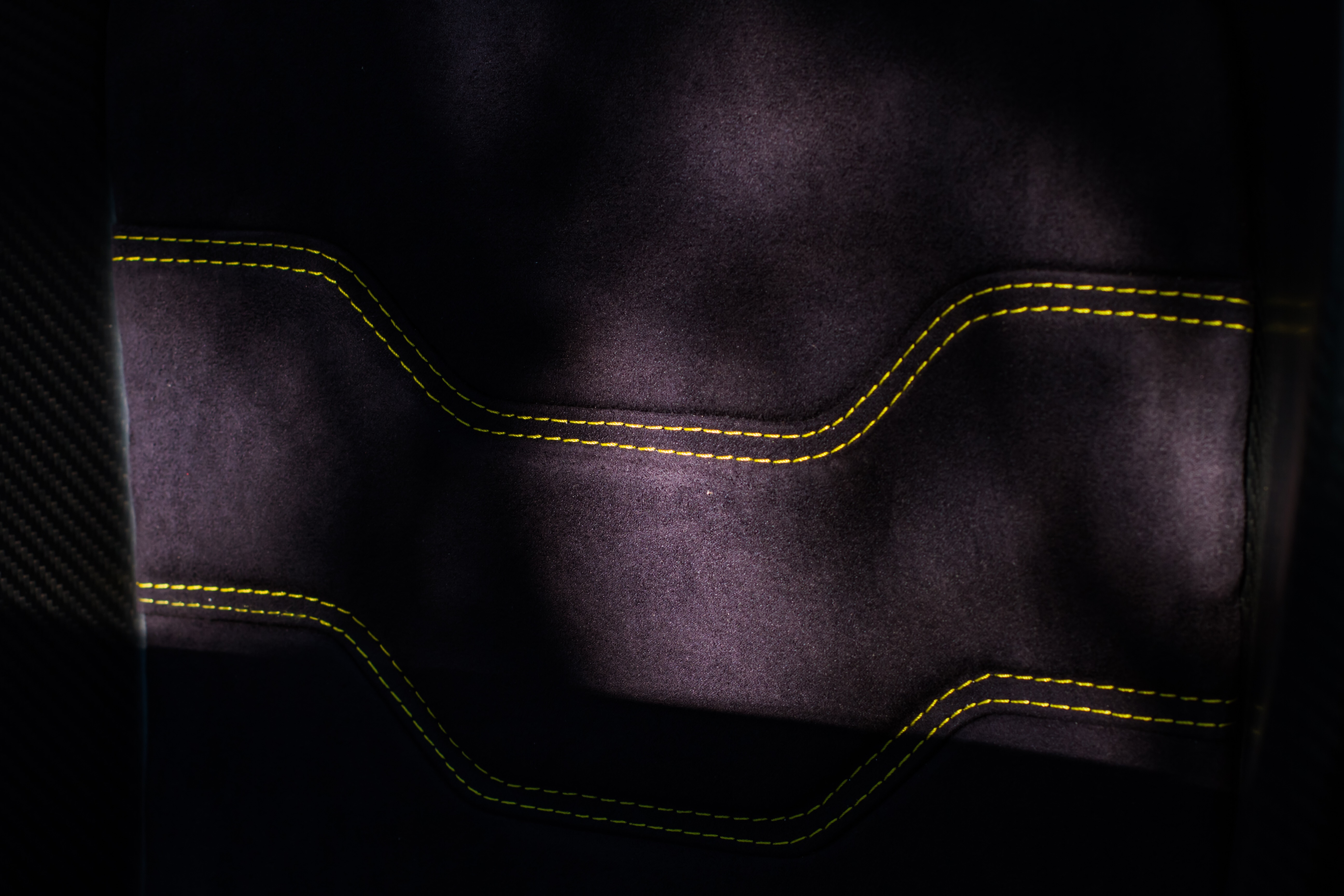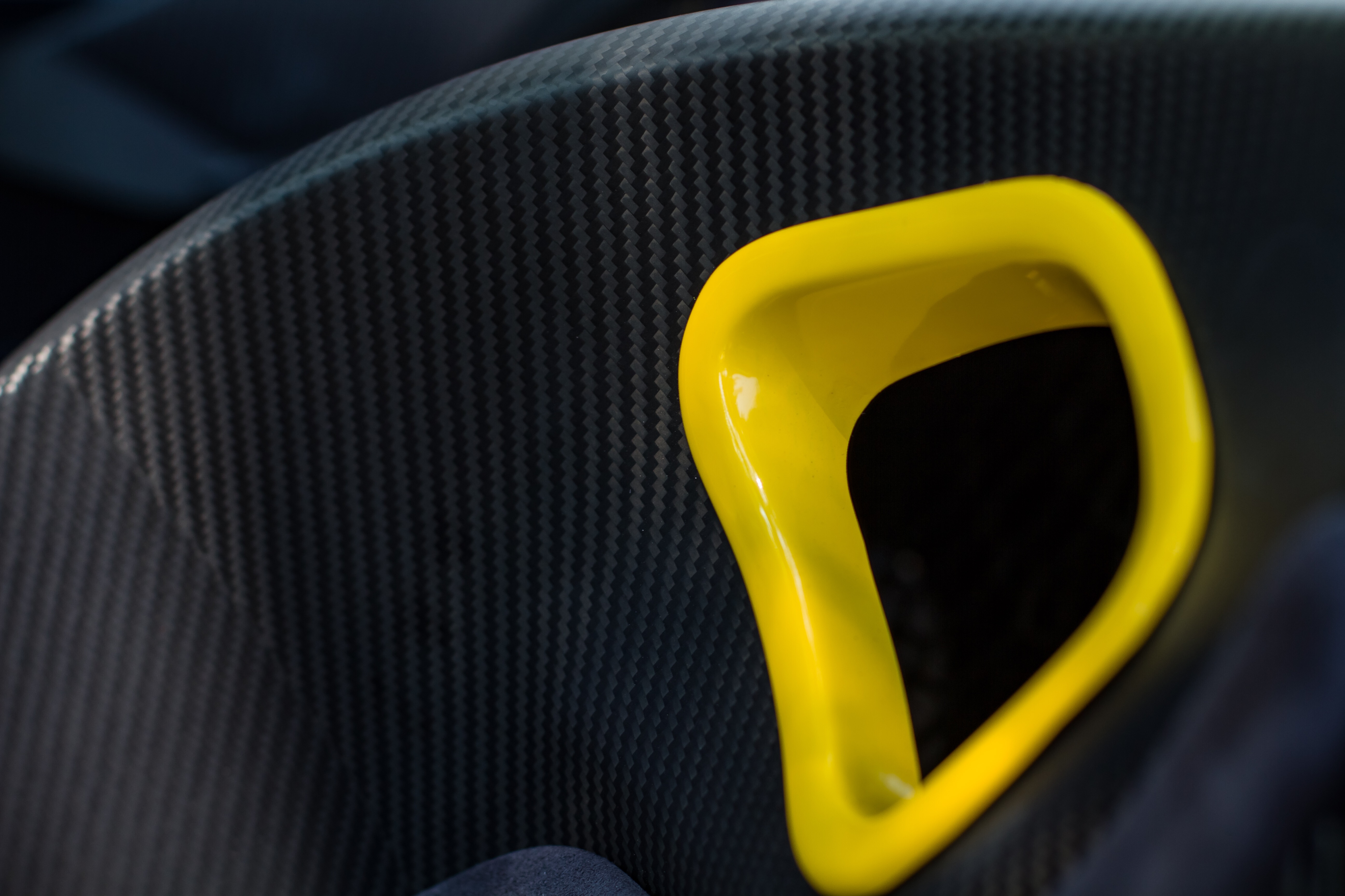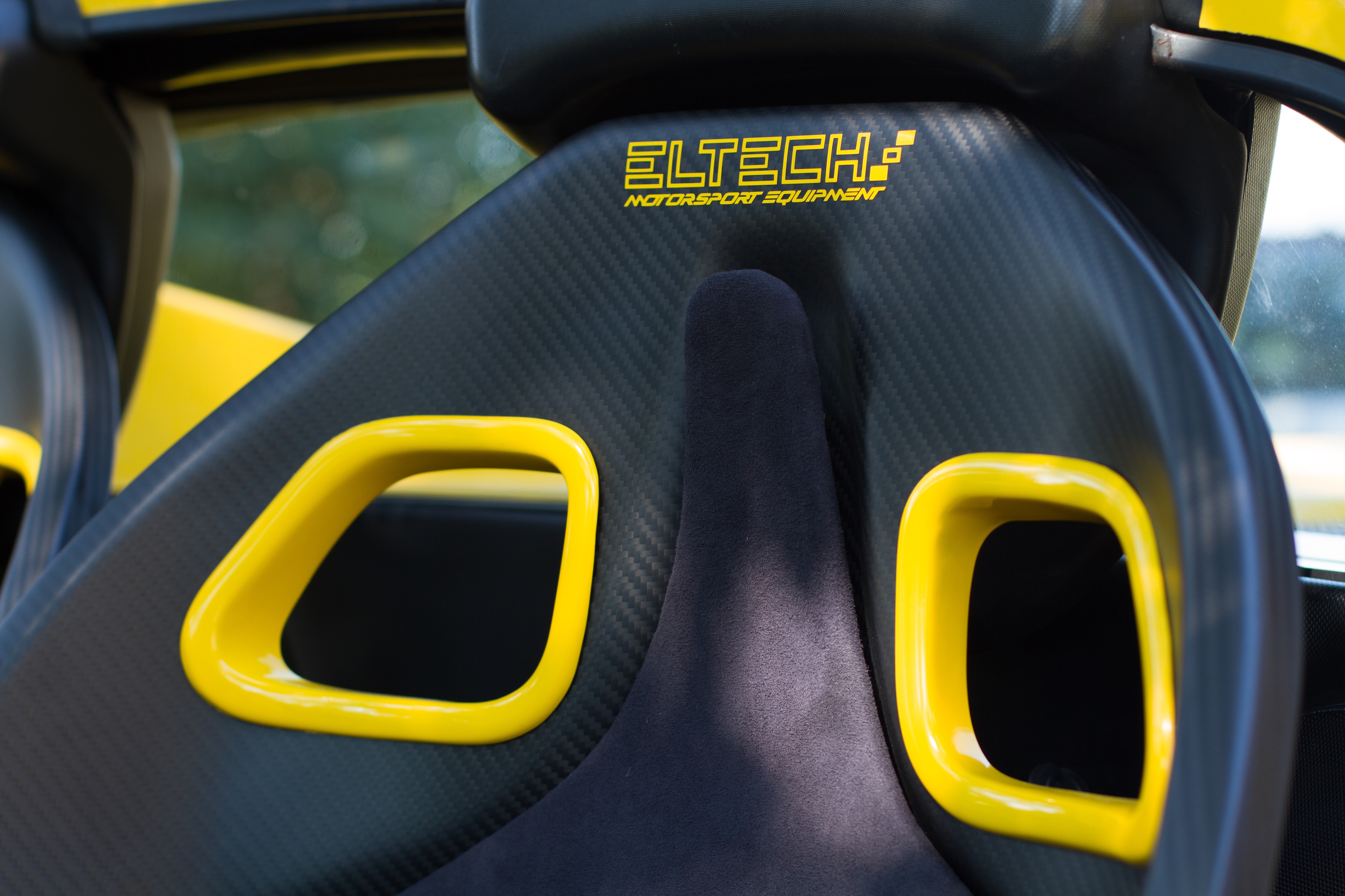 Deux sièges V1R d’eltech italia, avec les coussins alcantara surpiqués jaune.