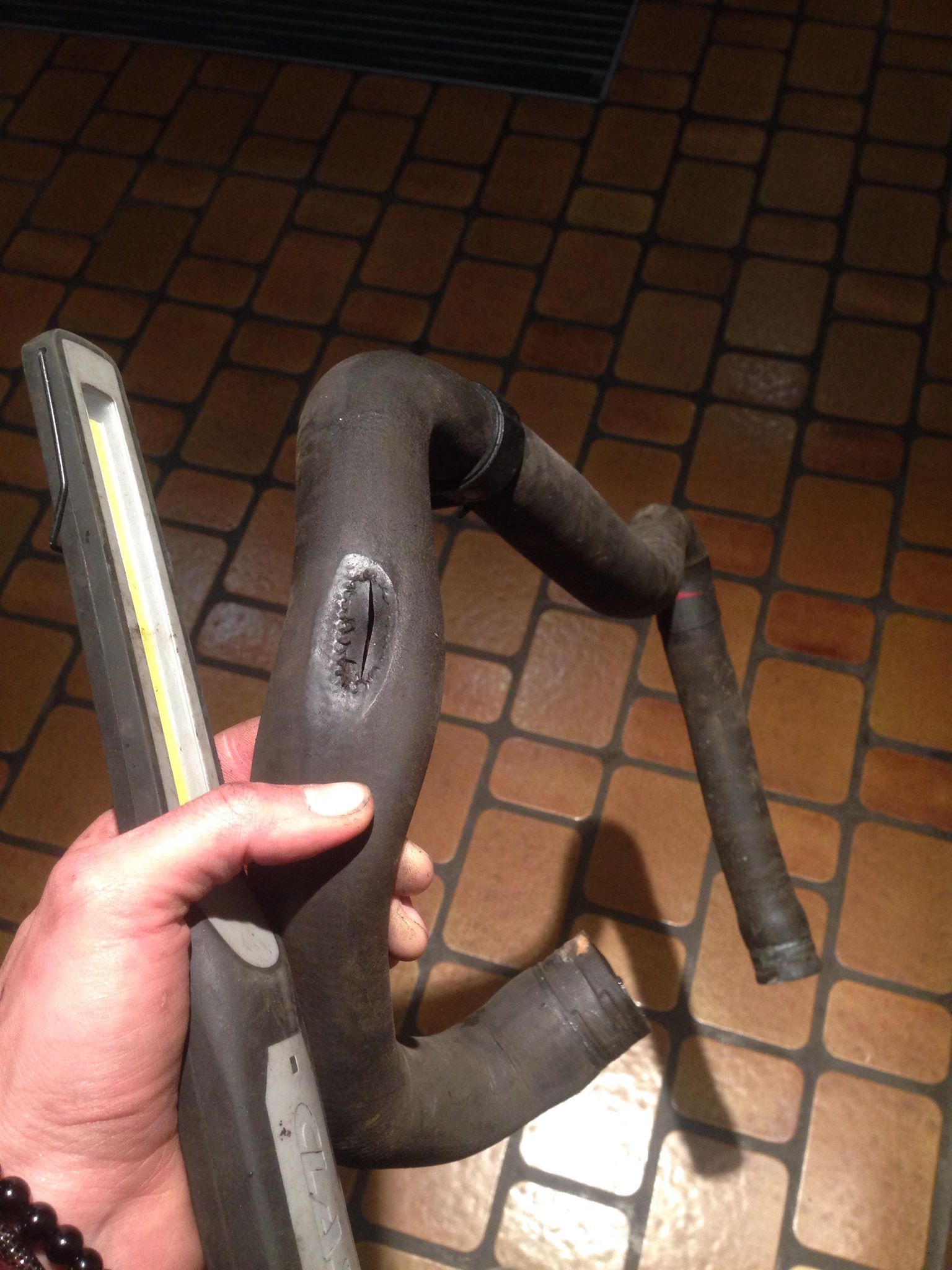 Résultat : durite inférieure du radiateur bouffée et fendue en 2.Putain, je nettoie nickel le dessous de la caisse plein d'huile avant hier et voilà que maintenant il est plein de liquide vert visqueux. Le même que j'ai remis dans le circuit de refroidissement y'a 2 jours.