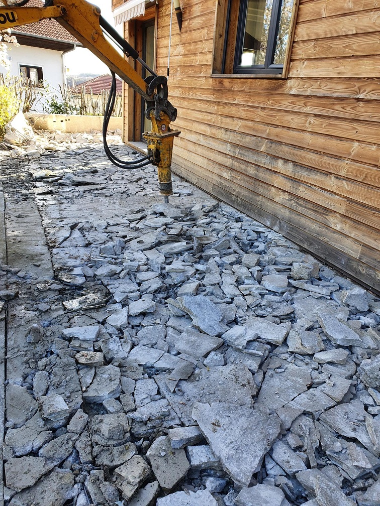 La dalle eétait solide, perso je ne comprenais pas l'intérêt de la casser, d'autant que le coté voisine était en béton armé, pure joie à détruire...