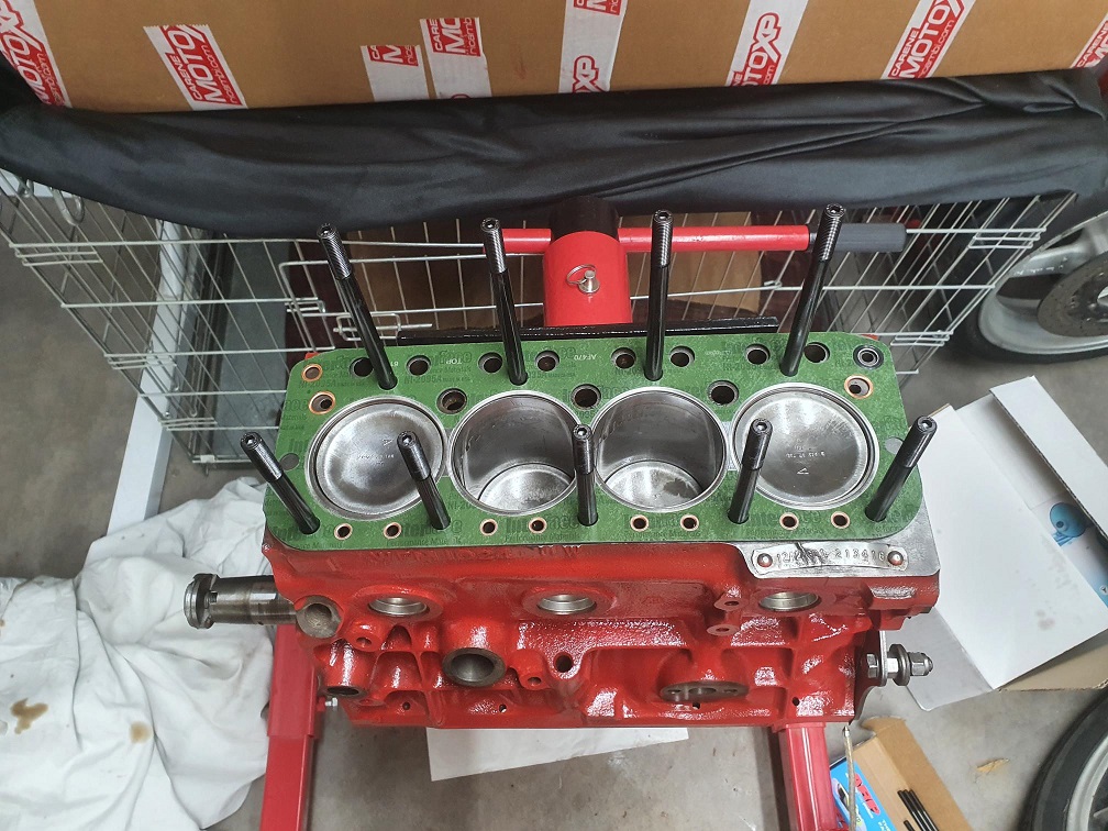 Puisqu'on y est on continue dans la lancée en montant les pistons, on change les coussinets de bielles, on change les segments par des Goetz (attention madame ça va frotter fort, mieux vaut bien lubrifier), on enquille chacun des pistons avec sa bielle dans le bloc, délicatement pour pas marquer ni le vilo ni les coussinets de bielle, dans le bon sens si possible et surtout dans le bon ordre, on serre au couple et c'est prêt (ici seulement le 1er de monté)