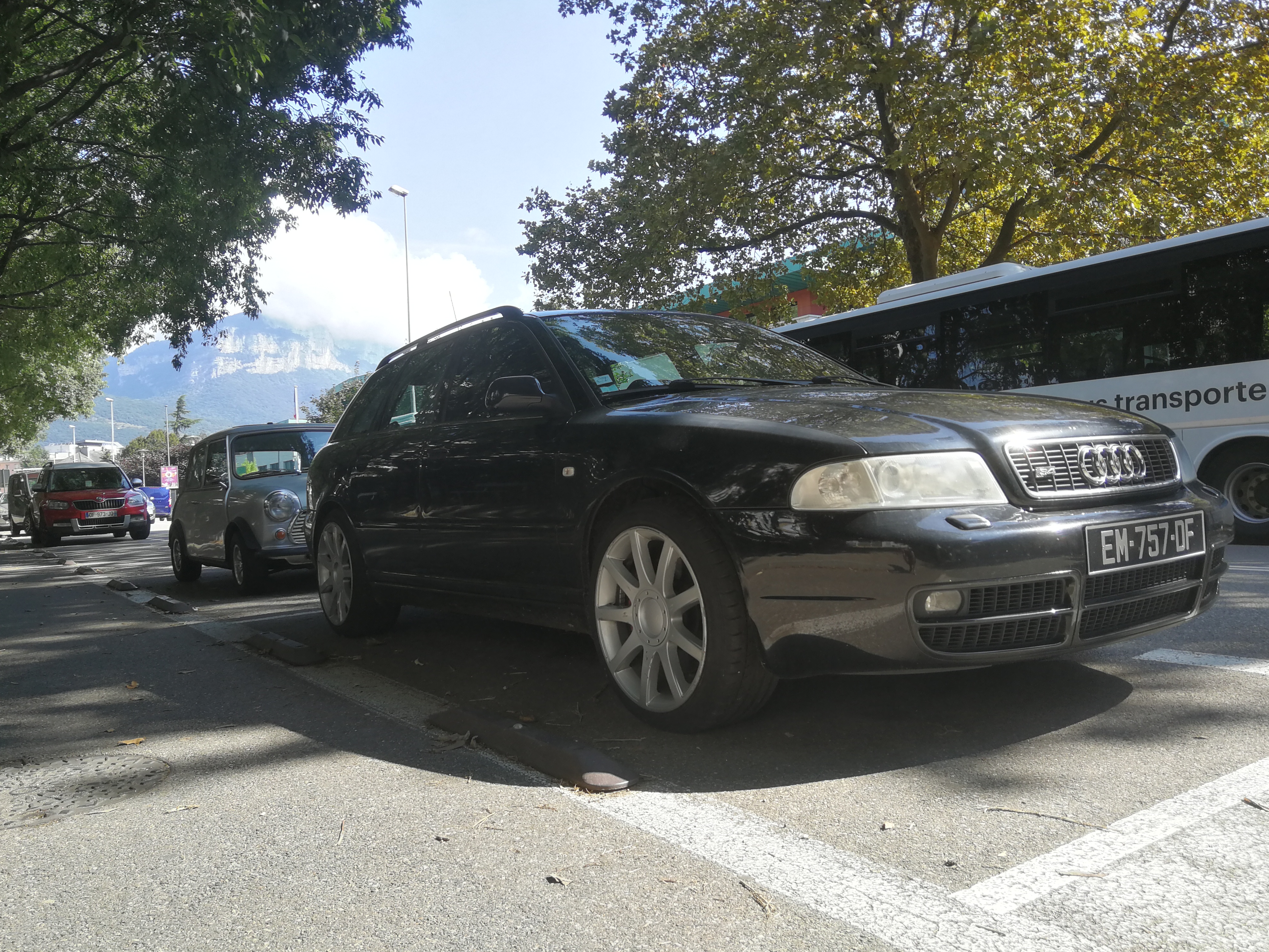 Bon, en vrai c'est vraiment + moche que ce à quoi je m'attendais... Les jantes sont pas hyper propres, les caches centraux ont été repeints à la bombe par un sombre connard donc on voit plus le logo Audi qui meuble visuellement le centre de la jante...
