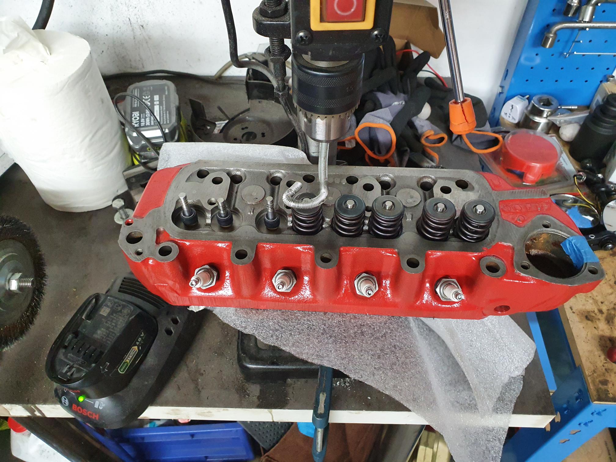 Vous noterez la réalisation d'un compresse ressort de soupape maison, une tige filetée de 8, un étau pour la tordre comme un crochet, une grosse rondelle et une perceuse à colonne. Note si jamais vous voulez réaliser ceci, trouver une rondelle assez épaisse (pour ne pas marquer les coupelles avec la tige filetée) mais surtout avec un trou intérieur de diamètre suffisant pour passer les clavettes en demi-lune. Mais normalement si vous en êtes à cette étape, vous les avez déjà démontées donc vous savez comment ça marche :D