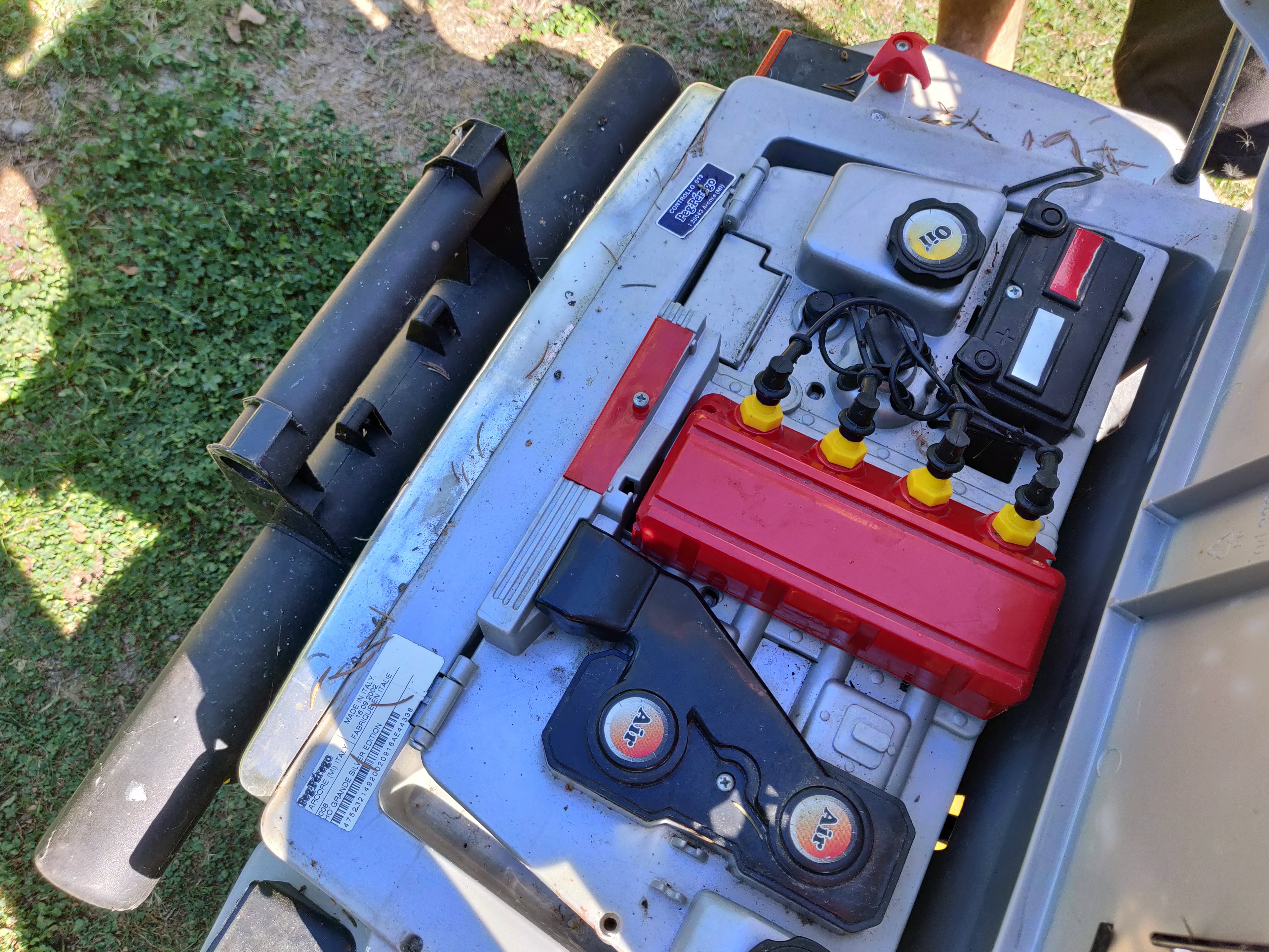 Là où ça devient drôle, c'est que l'emplacement de la batterie (sous le capot moteur) est assez généreux, et qu'on peut donc aisément y caser une petite batterie de voiture -type Alfa 33- (donc avec une autonomie de l'ordre d' une heure vs 20mn avec la petite batterie d'origine).