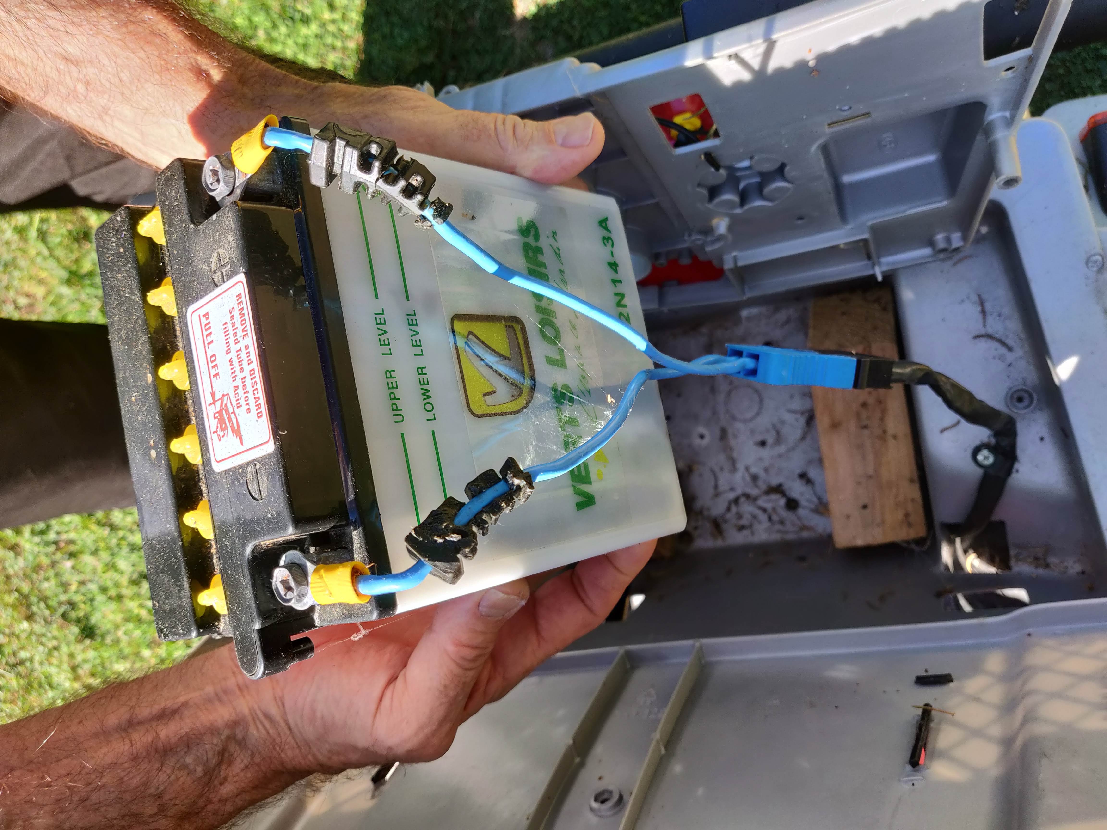 Petits renseignements pris auprès du sorcier bordelais, on va mettre une batterie de tracteur tondeuse. Ca tombe bien, le beau père part demain à la campagne et va ramener la batterie de son tracteur tondeuse stocké là bas pour tester.